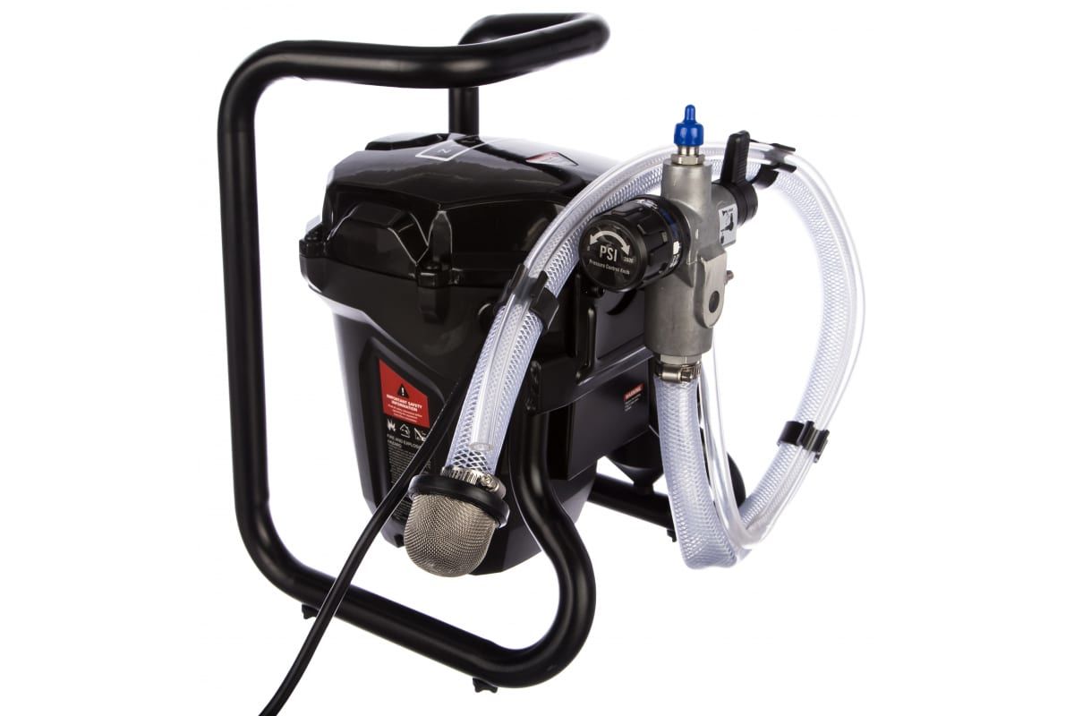 В комплектацию окрасочного аппарата, кроме самого аппарата, входят краскораспылитель, шланг для распыления, всасывающий шланг с фильтром, сопло, инструкция и упаковка. Окрасочный аппарат всасывает краску из ведра и подает ее для распыления по шлангу.